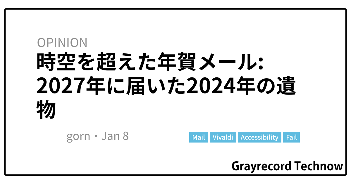 会社のメールボックスに届いたメールを見ていて、おかしなものを見つけてしまいました。Vivaldiの表示を見ると一年後になってる。そして、それ以外にもいろいろとおかしなところがある。 「 見どころ 」ポイント Dateヘッダーの怪 : 未来(2027年)からの送信と言う、メーラのソート順をかき乱す禁じ手。 alt属性の罠: 画像ブロック機能によって、隠していた「 2年前の使い回し 」が露呈する恐怖。 Vivaldiのプライバシー保護機能(画像読み込みブロック)が、図らずも企業の怠慢を暴き出すデバッガーとして機能してしまった瞬間です。 タイムトラベルするDateヘッダー まず、Date ヘッダーが 2027年 になっている点です。現在は2026年1月。 これをやられると、常にメーラーのリスト最上部にこのメールが居座ることになります。スパム業者がよくやる手口ですが、まさかテック企業を名乗る会社のニュースレターでこれを見るとは思いませんでした。 送信サーバーの設定ミスなのか、テンプレートの更新忘れなのかは不明ですが、受信者の体験を著しく損ねています。 alt属性に刻まれた「2024」の真実 そしてさらに衝撃的だったのが、画像の alt 属性(代替テキスト)です。 画像が表示されない状態でそこにあったのは、「 2024年賀状 」という文字。 2026年の正月に、2027年の日付で、2024年の挨拶が届く。 これが意味することは単純です。 「2年前のHTMLメールのテンプレートをコピーして、画像だけ差し替えて送信した」ということです。 画像のリンク先や src は変えたものの、目に見えない alt 属性の書き換えを怠ったのでしょう。 表面しか見ない「テック」企業 こういうことをやってしまうと、信頼性に大きな傷がつきます。 アクセシビリティの軽視: alt 属性は画像が見えない人(視覚障害者や、通信環境が悪い人、画像をブロックしている人)のための重要な情報です。そこに嘘(2年前の情報)を書くということは、そういったユーザーを切り捨てていると言っても過言ではありません。 技術力の欠如: 自動化されたテストや、送信前の基本的なQA(品質保証)プロセスが存在しない、あるいは機能していないことを露呈しています。 ブランドへのダメージ: 「表面の見た目(HTML画像)さえ整えれば中身(Dateやalt)はどうでもいい」という姿勢は、製品やサービスの品質そのものを疑わせます。 正直、がっくり来ました。営業メールだとしても、技術を売りにする企業からこんなものが届くと、武士の情けで社名は出しませんが、その会社の技術力もお里が知れるというものです。正月早々に開いた口がふさがりません。 教訓: メールの送信ボタンを押す前に、必ずテキストのみのモードや画像オフのモードでプレビューしましょう。そこには、あなたが隠したつもりの「恥」が残っているかもしれません。