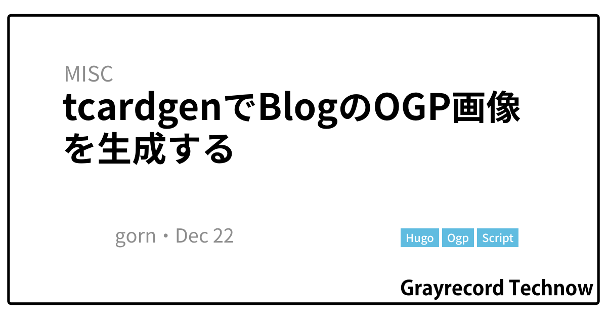 BLOGのアーティクルにOGPイメージは必要と思えたので、Hugo の OGP 画像を自動生成できる「tcardgen」を試したを参考にしています。実際、yamlの設定などは全く同じですし。違うとすれば、Windows環境なのでスクリプトをCMDのバッチファイルにしているくらいですね。 使用しているスクリプトはcovergen.batいう名前で内容は以下の通りの簡単なものです。 tcardgen -f tcardgen\fonts\ -o static\images\ogp\ -t tcardgen\template.png %1 OGP画像の配置先とか、そんなくらいですね、違うのは。テンプレートの画像は適当に作ったものです。