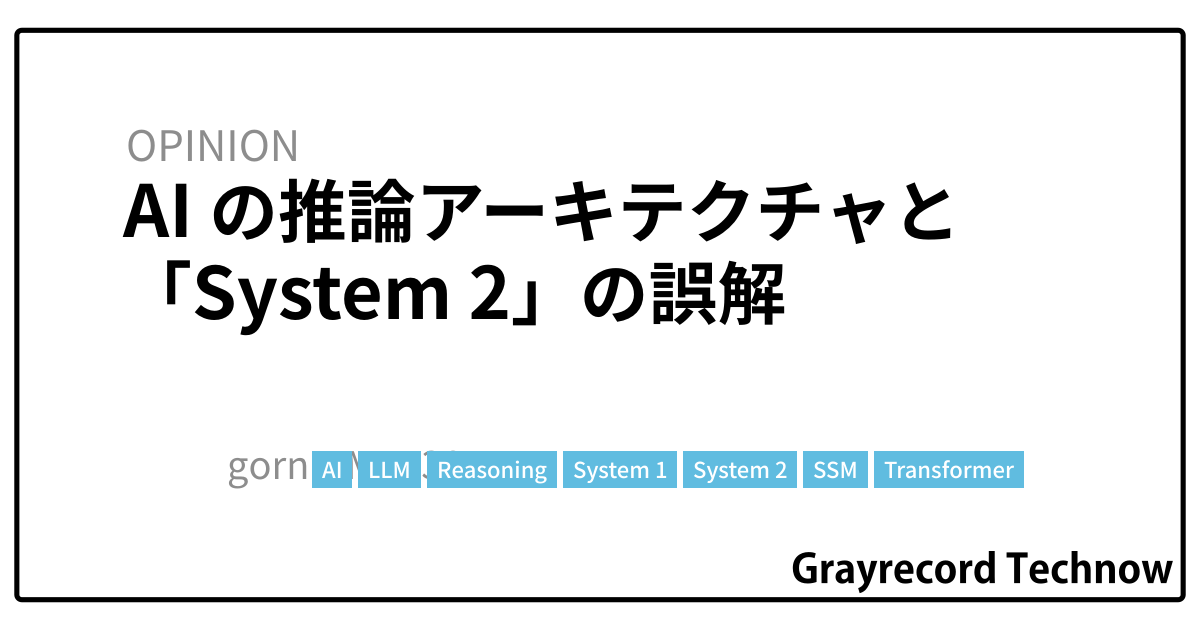 この記事に掲載されている図には、技術的な観点から違和感を覚えます。 特に、System 2 の隣に SSM(State Space Model)が並べられている点が不自然です。より正確には、System 2 は現状の Transformer や SSM 単体では実装不可能であると言うべきでしょう。System 2 は、統計的なアプローチによる「もっともらしさ」の追求だけで実現できるものではありません。 graph TD subgraph Layer3 [Layer 3: Orchestration] RAG[RAG] ReAct[ReAct] MCP[MCP] Agents[Agents] end subgraph Layer2 [Layer 2: Inference Strategy] CoT[CoT] ToT[ToT] Planning[Planning/Search] end subgraph Layer1 [Layer 1: Architecture] Transformer[Transformer] SSM[SSM] RWKV[RWKV] MoE[MoE] end Layer1 --> Layer2 Layer2 --> Layer3 レイヤー 構成要素(例) 本質的な役割 Layer 1: Architecture Transformer, SSM, RWKV, MoE 統計的な計算効率と表現力。計算複雑性をどう克服し、並列性をどう担保するかという 「土台」 の議論。 Layer 2: Inference Strategy CoT, ToT, Planning/Search 統計モデルの「回し方」。モデルに思考プロセスを模倣させ、統計的な妥当性を高めるための 「手順」 の議論。 Layer 3: Orchestration RAG, ReAct, MCP, Agents 外部世界とのインタフェース。モデルが感知できない最新情報や外部ツールと連携するための 「運用の仕組み」 の議論。 元の図の作成者にとって、AI は「課題を解決するための魔法のツール」の詰め合わせに見えているのかもしれません。しかし、以下の境界線が曖昧になっているように見受けられます。 ...